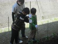 そこで、もっと大きくなってほしいと願いを込めながら、ファミリー班ごとに畑の手入れを行いました。収穫時期が楽しみです。